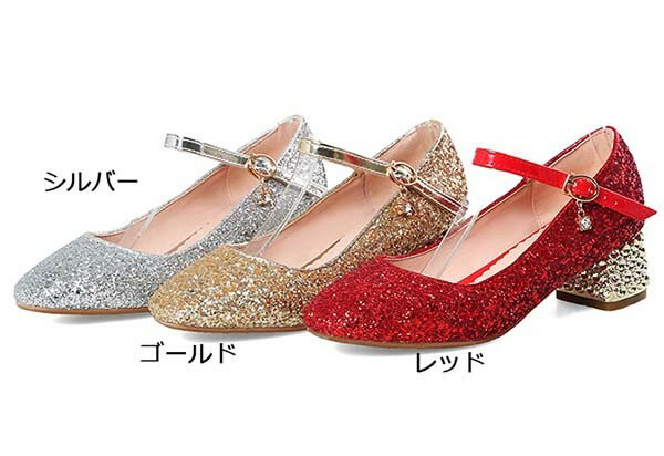 キッズ シューズ パンプス ガール 靴 キラキラ ビジュー お姫様 おめかし ドレスアップ 甲ベルト ピアノ発表会 リボン 銀/金/赤 プリンセス 女の子 かわいい ストラップ